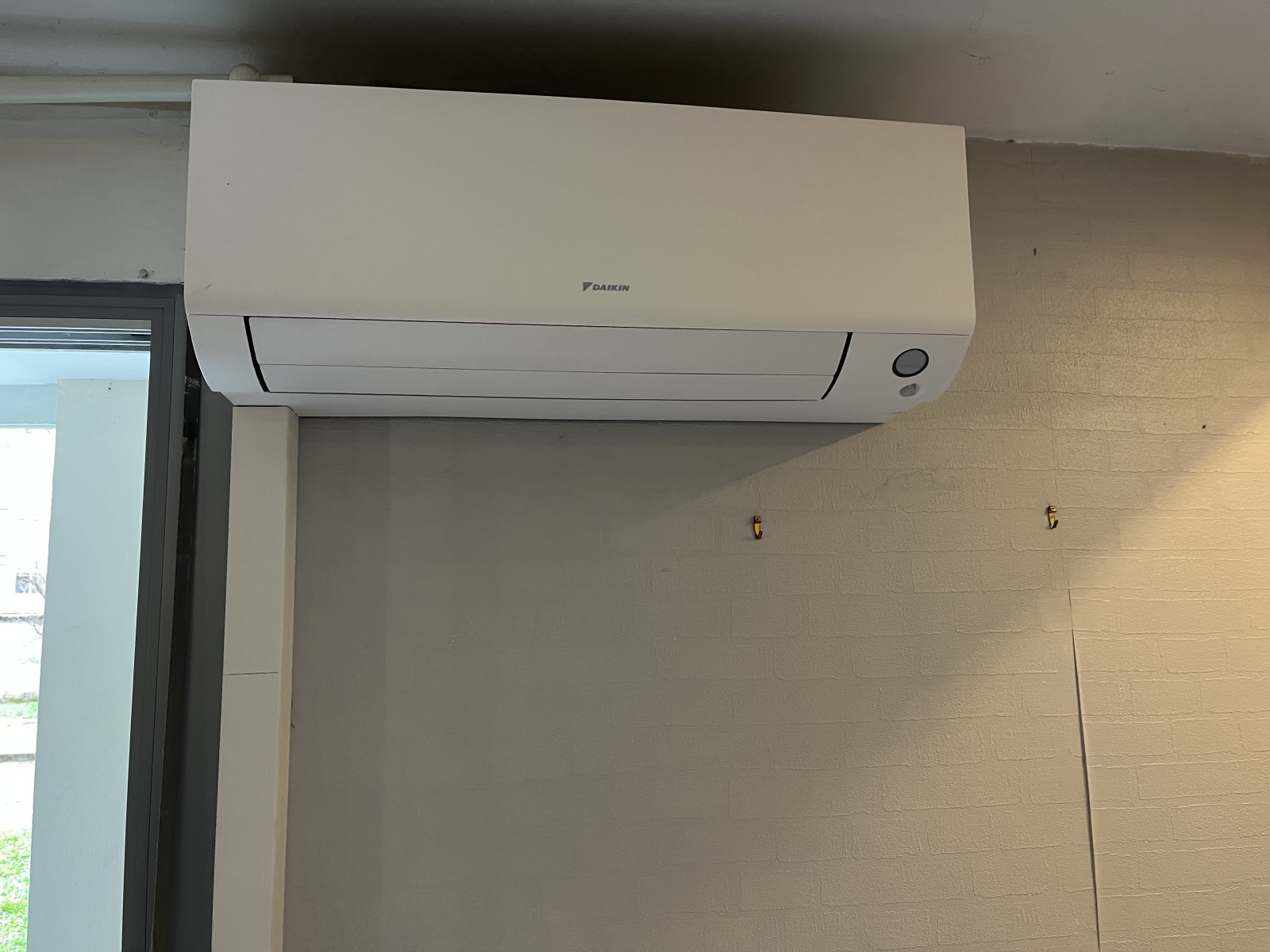 Une étude technique a été réalisée pour déterminer la puissance nécessaire. Un climatiseur DAIKIN mono split de 3,5 kW a été sélectionné, idéal pour assurer une température homogène dans l’ensemble du studio. L’unité intérieure a été positionnée de manière stratégique pour une diffusion optimale de l’air, tandis que le groupe extérieur a été installé sur le balcon, en respectant les contraintes acoustiques et esthétiques fixée par la copropriété.