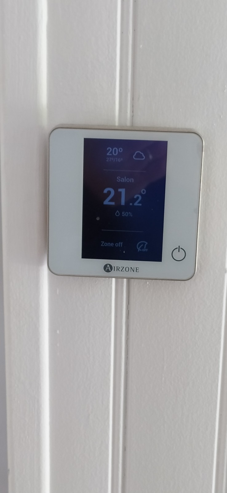 Notre client a souhaitez pouvoir se chauffer et se rafraîchir indépendamment dans chacune des pièces traitées, d’où la régulation multizone AIRZONE. J’ai fais le choix de l’orienter sur des télécommandes filaires pour plus de fiabilité et surtout moins de piles ! Ne vous en faites pas, nous sommes passées par les gaines électriques existantes afin de pas installer de goulotte. Et oui l’esthétique à ça compte !